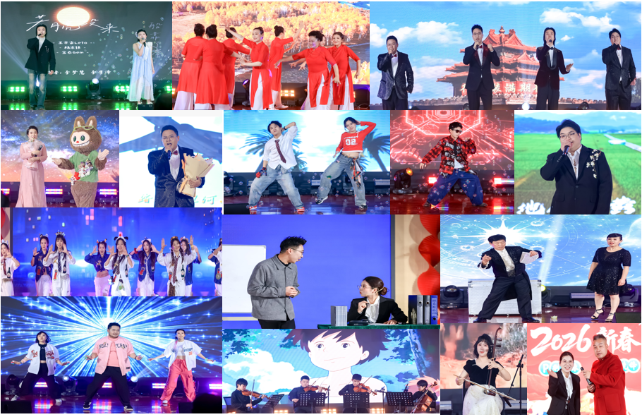 此次团拜会舞蹈节目魅力四射,引燃全场:开场舞《疯狂动物城》以动感澎湃的舞姿将大家的情绪迅速带入高潮;学生与少儿街舞《Body》《Vibe》在强劲的节拍中尽情诠释着青春的活力、纯粹的快乐与蓬勃的自信;动感舞蹈《Get it lit》延续热烈基调,用利落的舞步持续点燃现场每一位观众的激情。离退休老同志们带来的气舞《雁云间》别具韵味,柔中藏刚,尽显岁月沉淀的从容与雅致。歌曲节目铿锵有力、宛转悠扬:《向天再借五百年》与《少年中国说》慷慨激昂,唱出了过程工程人胸怀家国、奋勇争先的豪情壮志;《若月亮没来》《落在生命里的光》则以温柔婉转的旋律、真挚动人的歌声,传递出心底的暖意与美好。压轴歌曲《未来我来》基调昂扬、情感真挚,字字句句唱出了过程工程人笃行实干、报效祖国的赤诚心声。曲艺和乐器表演同样精彩纷呈:小品《如何解读》以诙谐幽默的演绎,将职场百态刻画得淋漓尽致,引发共鸣;弦乐四重奏《永远同在》旋律舒缓悠扬,用细腻的演奏治愈人心;相声《戏曲漫谈》凭借风趣诙谐的台词、灵活默契的互动,引得现场笑声连连;口技表演则以炉火纯青的技艺,模仿出多样声音,赢得满堂喝彩;魔术《大变活人》构思巧妙、悬念迭起,尽显奇幻魅力;二胡表演《赛马》节奏明快、激昂奔放,将骏马奔腾的壮阔景象展现得栩栩如生。